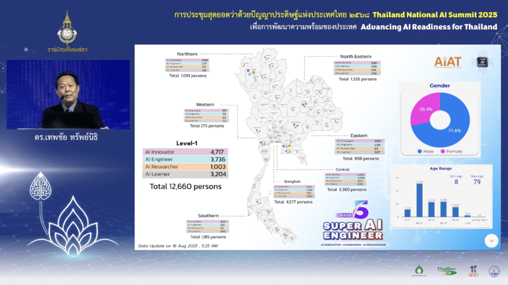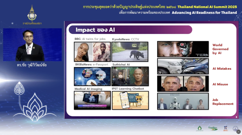 สมาคมปัญญาประดิษฐ์ประเทศไทย (AIAT) ร่วมงาน “การประชุมสุดยอดว่าด้วยปัญญาประดิษฐ์แห่งประเทศไทย 2568 (Thailand National AI Summit 2025)” ภายใต้แนวคิด “เพื่อการพัฒนาความพร้อมด้านปัญญาประดิษฐ์สำหรับประเทศไทย” จัดโดยราชบัณฑิตยสภา เนื่องในโอกาสเฉลิมฉลองครบรอบ 100 ปี ราชบัณฑิตยสภา ระหว่างวันที่ 10 – 11 กันยายน 2568 ณ ห้องประชุม 3-4 ศูนย์การประชุมแห่งชาติสิริกิติ์ เพื่อเปิดเวทีนำเสนอแผนยุทธศาสตร์และแลกเปลี่ยนมุมมองจากผู้เชี่ยวชาญชั้นนำของประเทศ