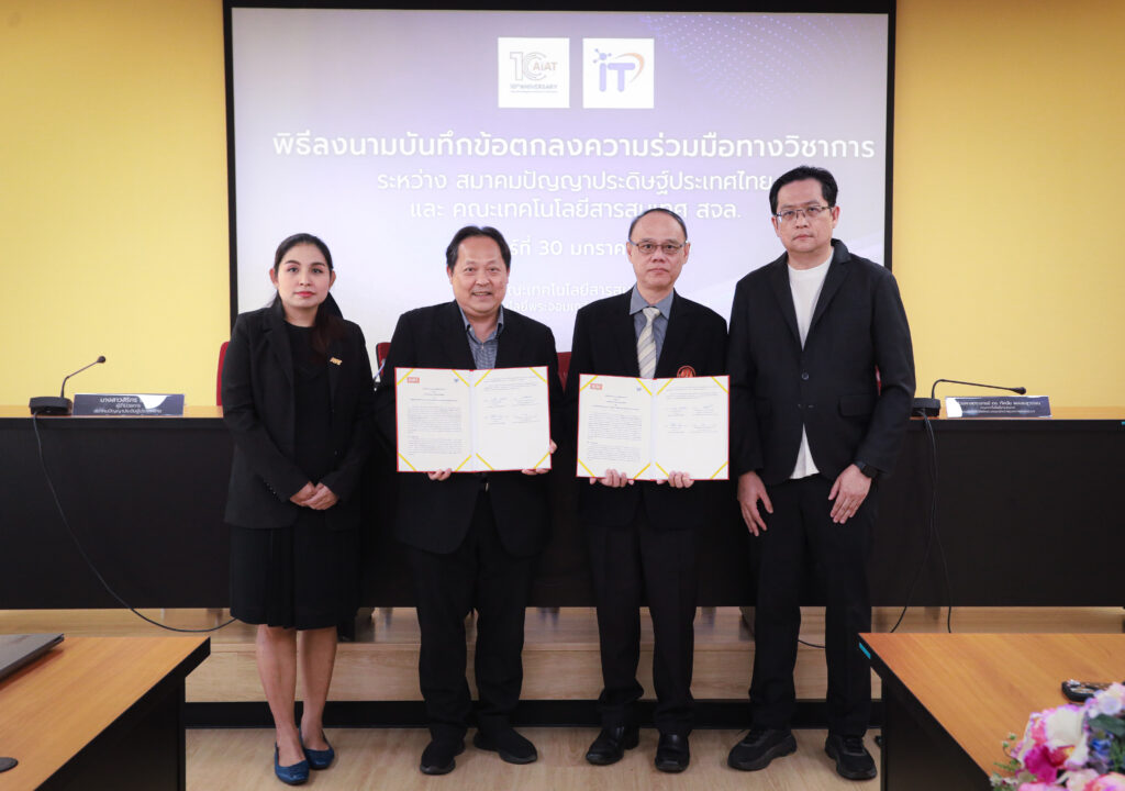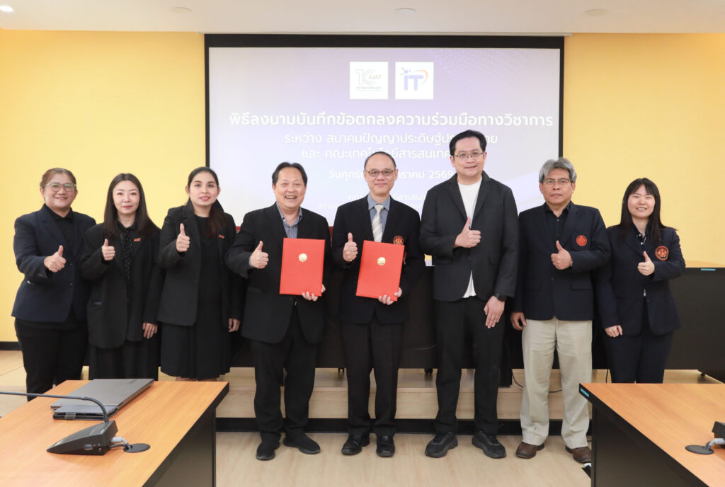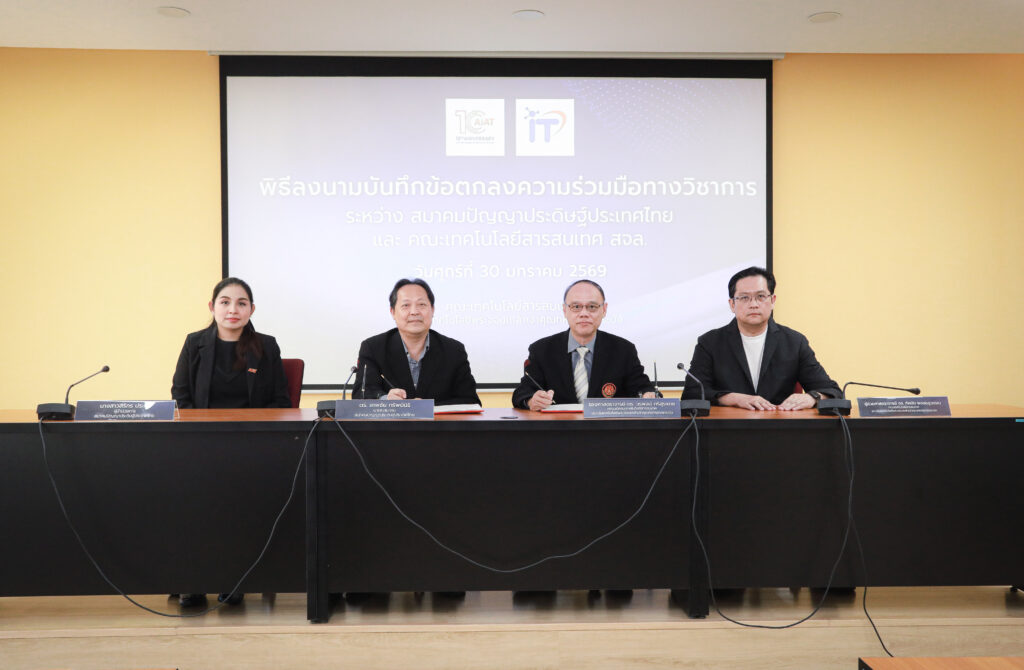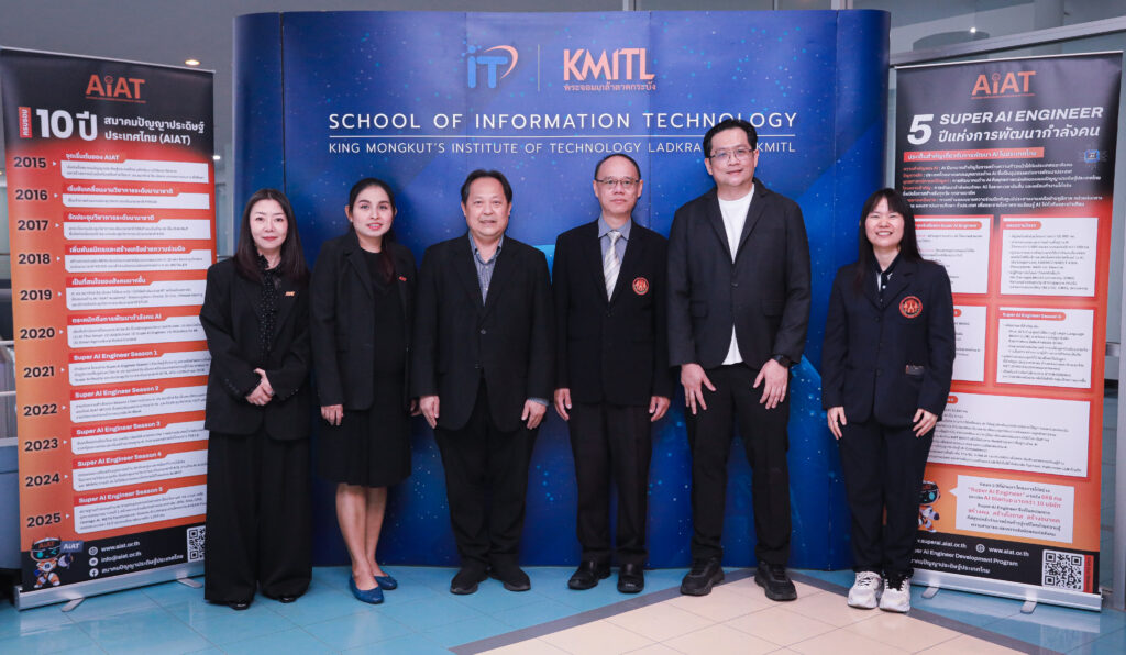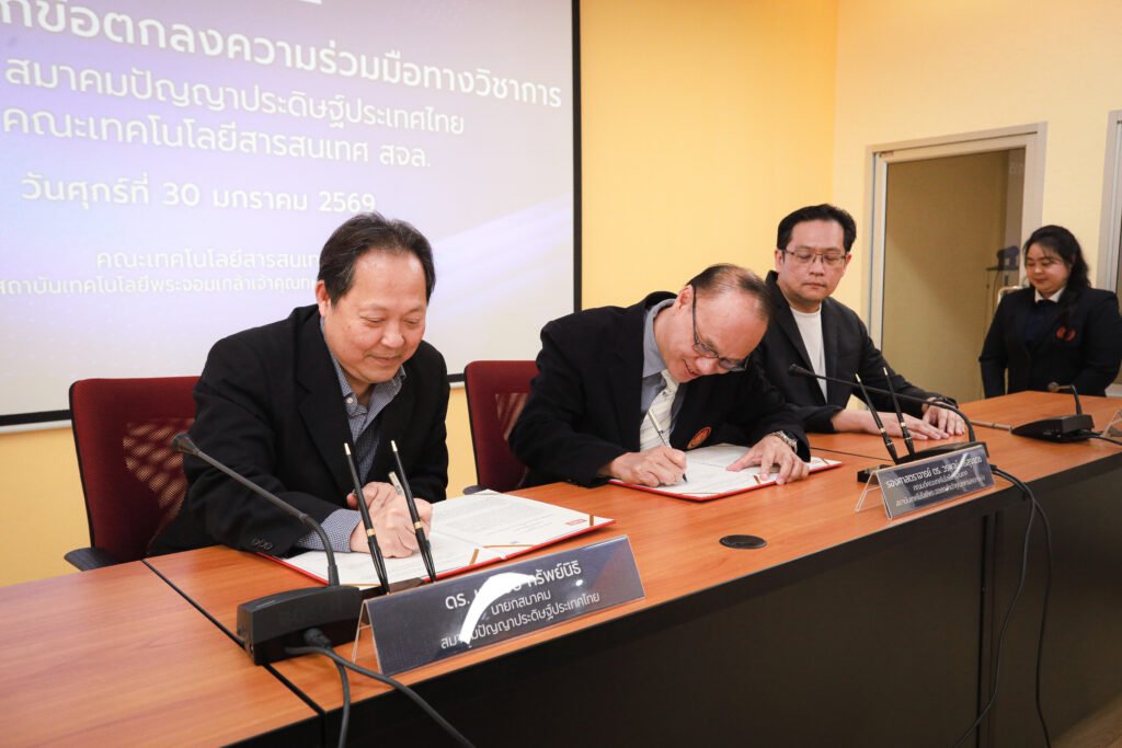 วันที่ 30 มกราคม 2569 สมาคมปัญญาประดิษฐ์ประเทศไทย (AIAT) และ คณะเทคโนโลยีสารสนเทศ สถาบันเทคโนโลยีพระจอมเกล้าเจ้าคุณทหารลาดกระบัง ร่วมลงนามบันทึกข้อตกลงความร่วมมือทางวิชาการด้านปัญญาประดิษฐ์ เพื่อผสานศักยภาพของทั้งสองหน่วยงานในการพัฒนาบุคลากร ส่งเสริมความเป็นเลิศทางวิชาการและการวิจัย ตลอดจนการบริการวิชาการแก่สังคม อันจะนำไปสู่การยกระดับศักยภาพด้านปัญญาประดิษฐ์ของประเทศอย่างยั่งยืน โดยพิธีลงนามจัดขึ้น ณ ห้องประชุม 614 ชั้น 6 คณะเทคโนโลยีสารสนเทศ สจล. กรุงเทพฯ