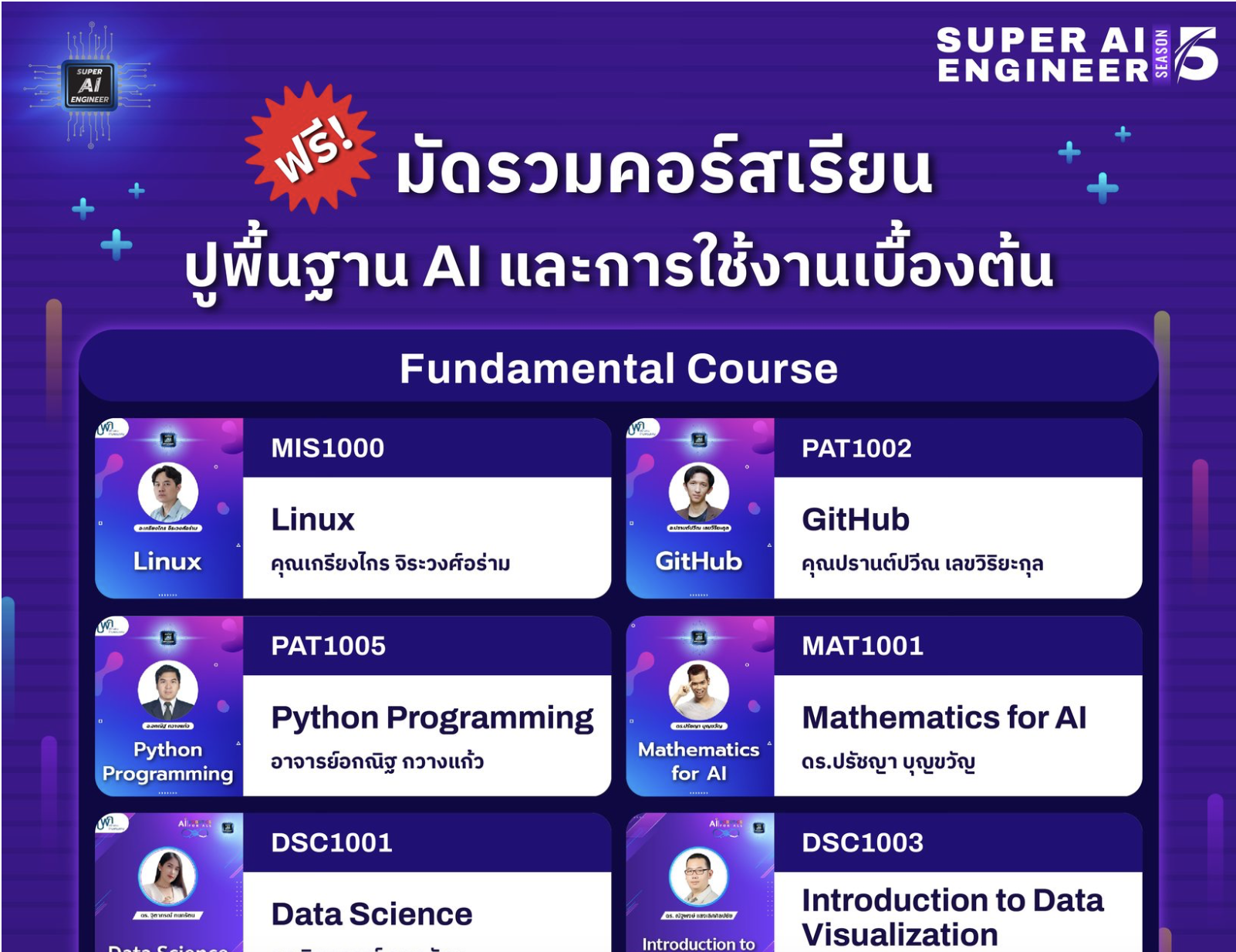 มาอัปสกิล AI ไปกับ AIAT MOOC เรียนรู้ทักษะใหม่ที่จะทำให้คุณเก่งขึ้นอย่างก้าวกระโดด Fundamental Course หลักสูตรนี้เหมาะสำหรับผู้เริ่มต้นที่มีความสนใจเรียนรู้เกี่ยวกับ AI เบื้องต้น ไปจนถึงการใช้งานพื้นฐานไม่ว่าจะเป็น – Linuxปูพื้นฐานการใช้งานระบบปฏิบัติการ Linux ตั้งแต่คำสั่งพื้นฐาน ไปจนถึงการจัดการไฟล์ ระบบสิทธิ์ และการใช้งาน Linux