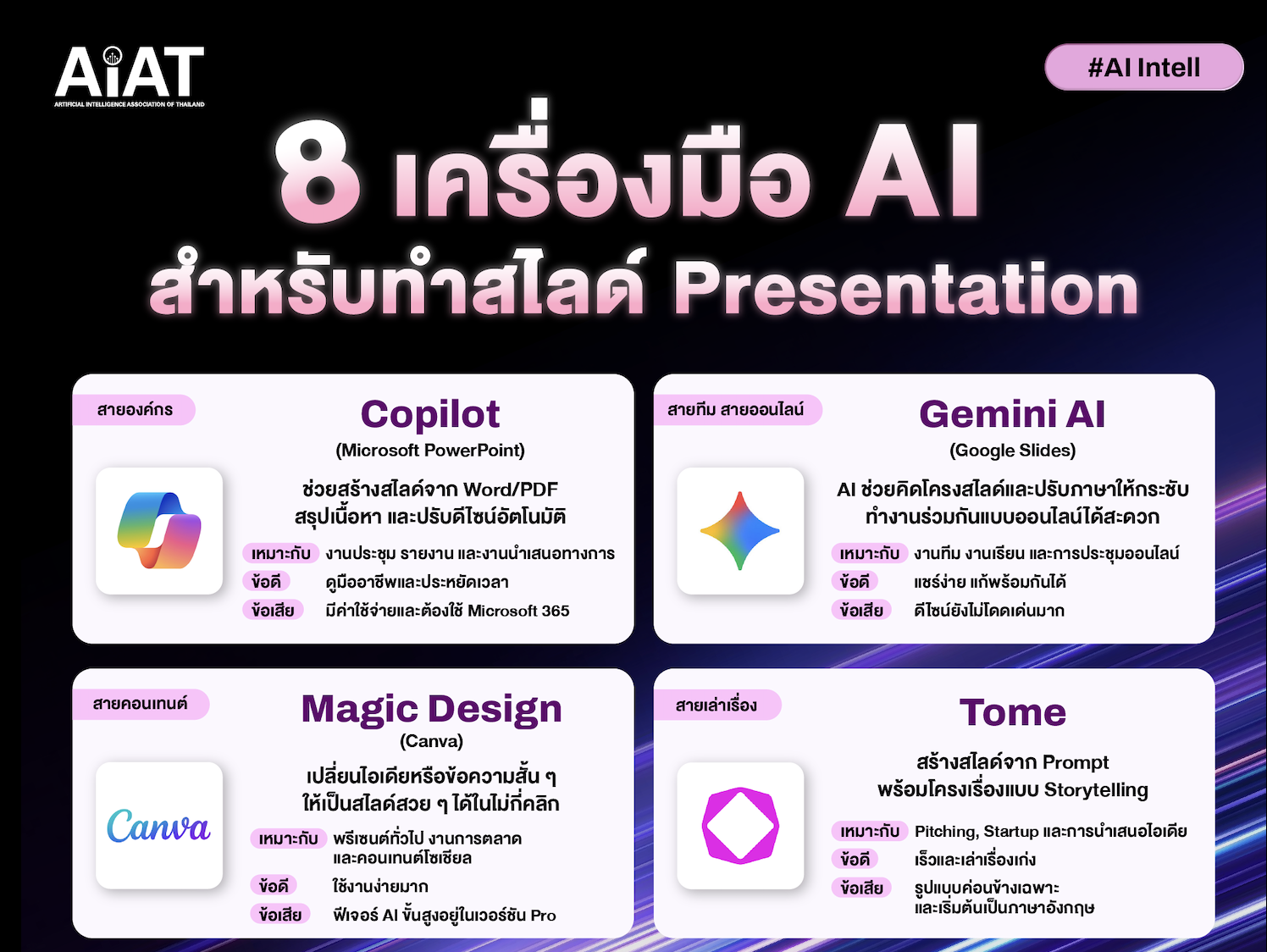 8 เครื่องมือ AI สำหรับทำสไลด์ Presentationเปลี่ยนไอเดียให้เป็นสไลด์สวย ๆ ได้เร็วกว่าเดิมหลายเท่า ในยุคที่เวลาเป็นทรัพยากรสำคัญ การทำสไลด์ไม่จำเป็นต้องเริ่มต้นใหม่ทุกครั้งAI เข้ามาเป็นผู้ช่วยที่ช่วยยกระดับคุณภาพการสร้าง Presentation ให้ง่าย เร็ว ตรงโจทย์ และดียิ่งกว่าเดิม วันนี้เราจะมาแนะนำ 8 เครื่องมือ AI ที่ช่วยให้คุณทำสไลด์ง่ายขึ้น
