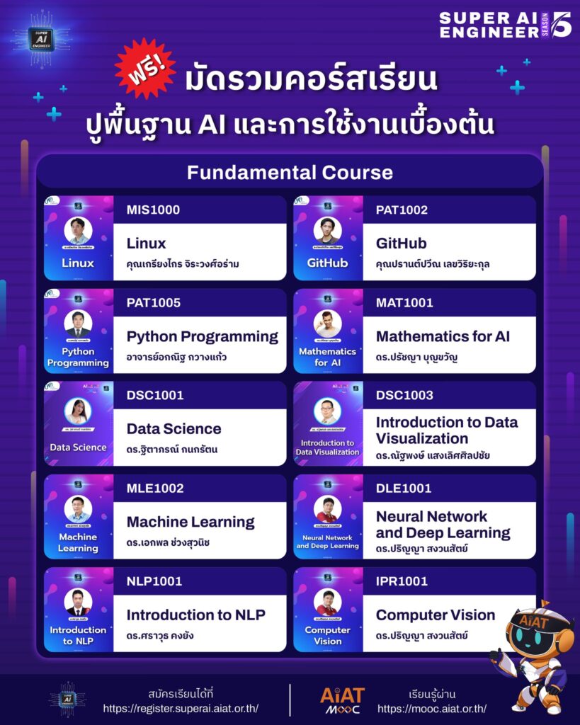 มาอัปสกิล AI ไปกับ AIAT MOOC เรียนรู้ทักษะใหม่ที่จะทำให้คุณเก่งขึ้นอย่างก้าวกระโดด Fundamental Course หลักสูตรนี้เหมาะสำหรับผู้เริ่มต้นที่มีความสนใจเรียนรู้เกี่ยวกับ AI เบื้องต้น ไปจนถึงการใช้งานพื้นฐานไม่ว่าจะเป็น – Linuxปูพื้นฐานการใช้งานระบบปฏิบัติการ Linux ตั้งแต่คำสั่งพื้นฐาน ไปจนถึงการจัดการไฟล์ ระบบสิทธิ์ และการใช้งาน Linux Command อย่างมีประสิทธิภาพ– GitHubเรียนรู้วิธีใช้ GitHub ในการจัดการโค้ด ทำเวอร์ชันคอนโทรล (Version Control) และทำงานร่วมกันแบบทีมได้อย่างมีประสิทธิภาพ– Python Programmingพัฒนาทักษะในการเขียนโปรแกรมด้วย Python เพื่อเตรียมตัวให้พร้อมกับการสร้าง AI ด้วยตัวเอง– Mathematics for AIเตรียมพร้อมสู่โลก AI ด้วยคอร์ส Mathematics for AI ที่จะเสริมสร้างพื้นฐานคณิตศาสตร์ให้คุณ!– Data Scienceคอร์สนี้จะช่วยให้ทุกคนเห็นภาพรวมของโลกวิทยาศาสตร์ข้อมูลได้ดีขึ้น และพาทุกคนไปสัมผัสกับข้อมูลในแง่มุมต่าง ๆ– Introduction to Data Visualizationเรียนรู้เทคนิคและเครื่องมือที่จะช่วยนำเสนอข้อมูลในรูปแบบที่น่าสนใจที่สุด!– Neural Network and […]